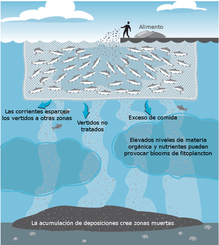 Las características físicas y químicas del medio, los niveles de nutrientes, la proximidad a hábitats sensibles, la profundidad y las corrientes determinarán el impacto causado por los vertidos de las granjas de acuicultura